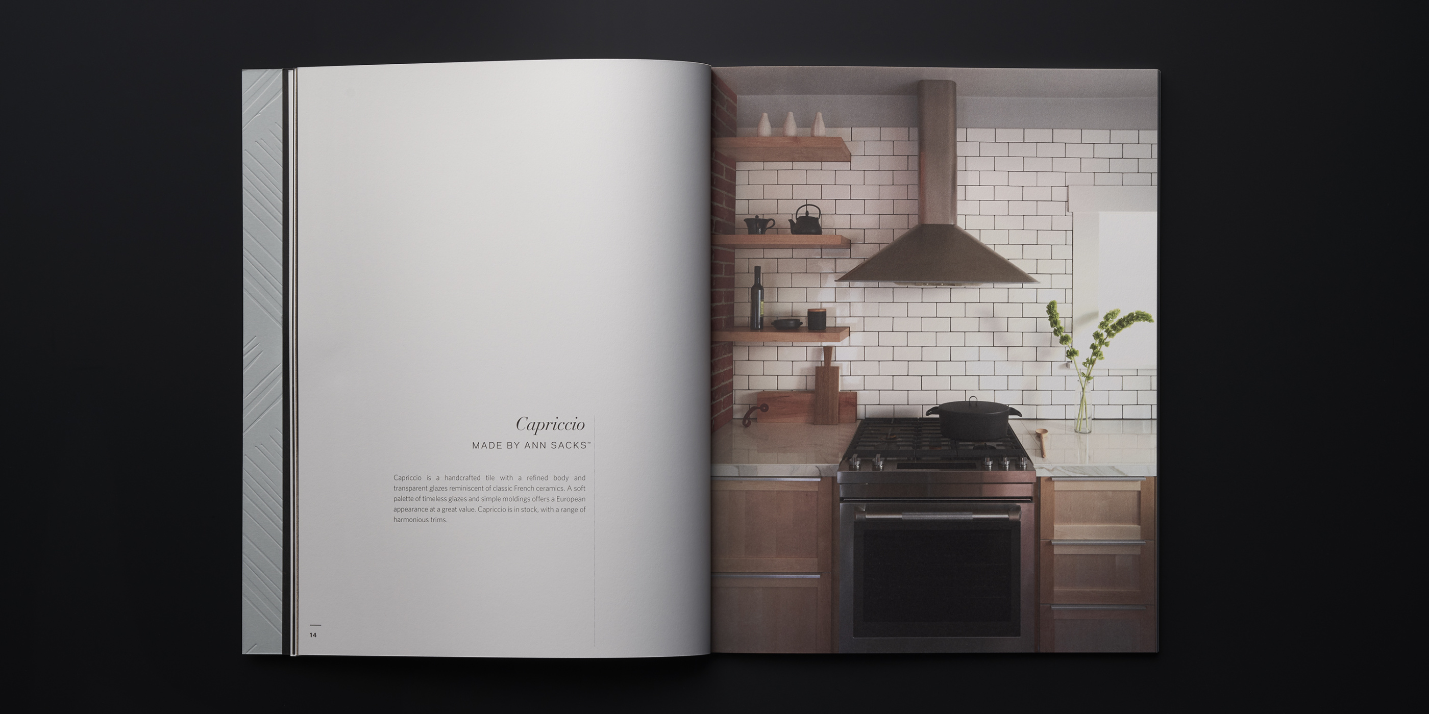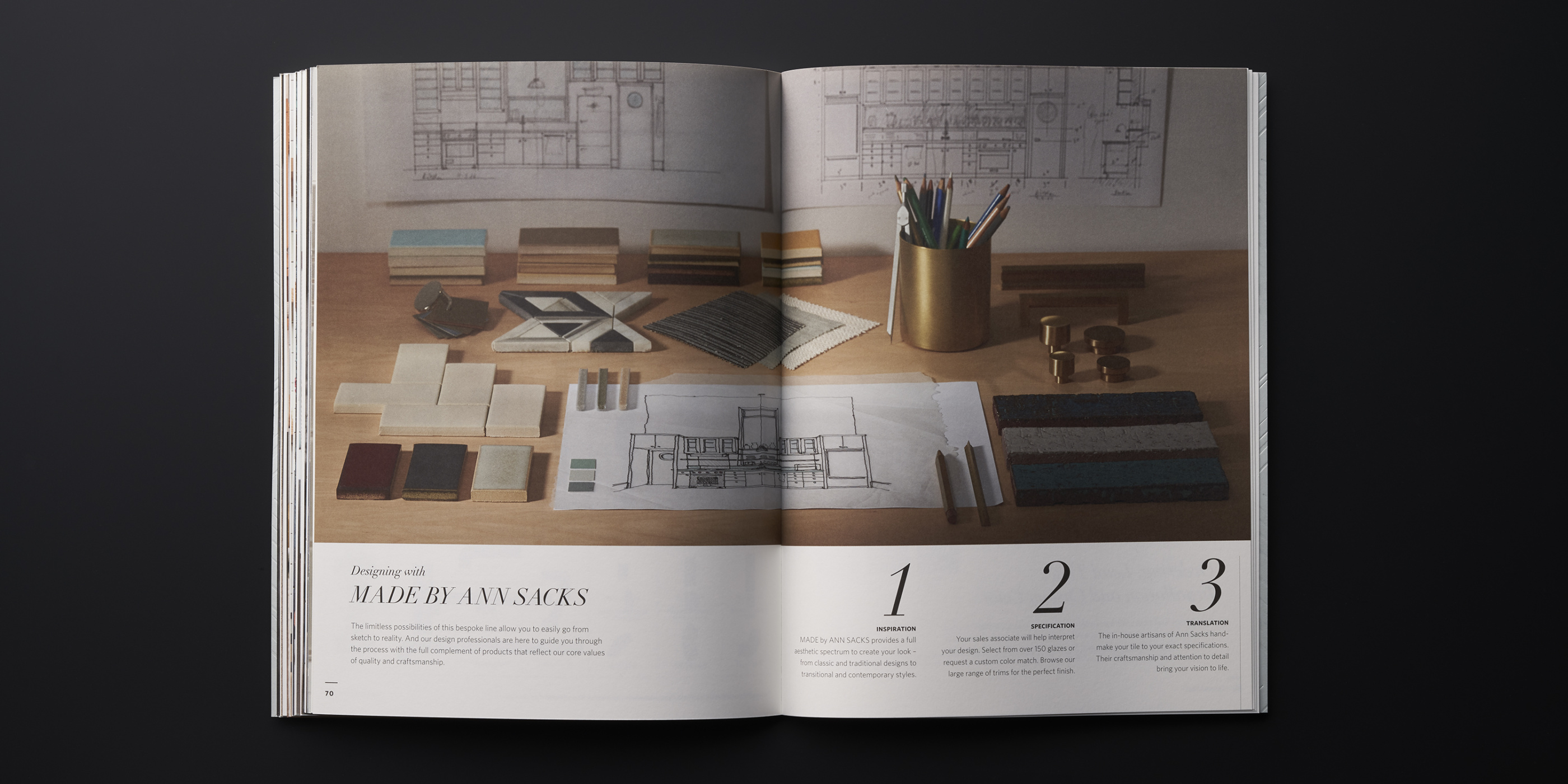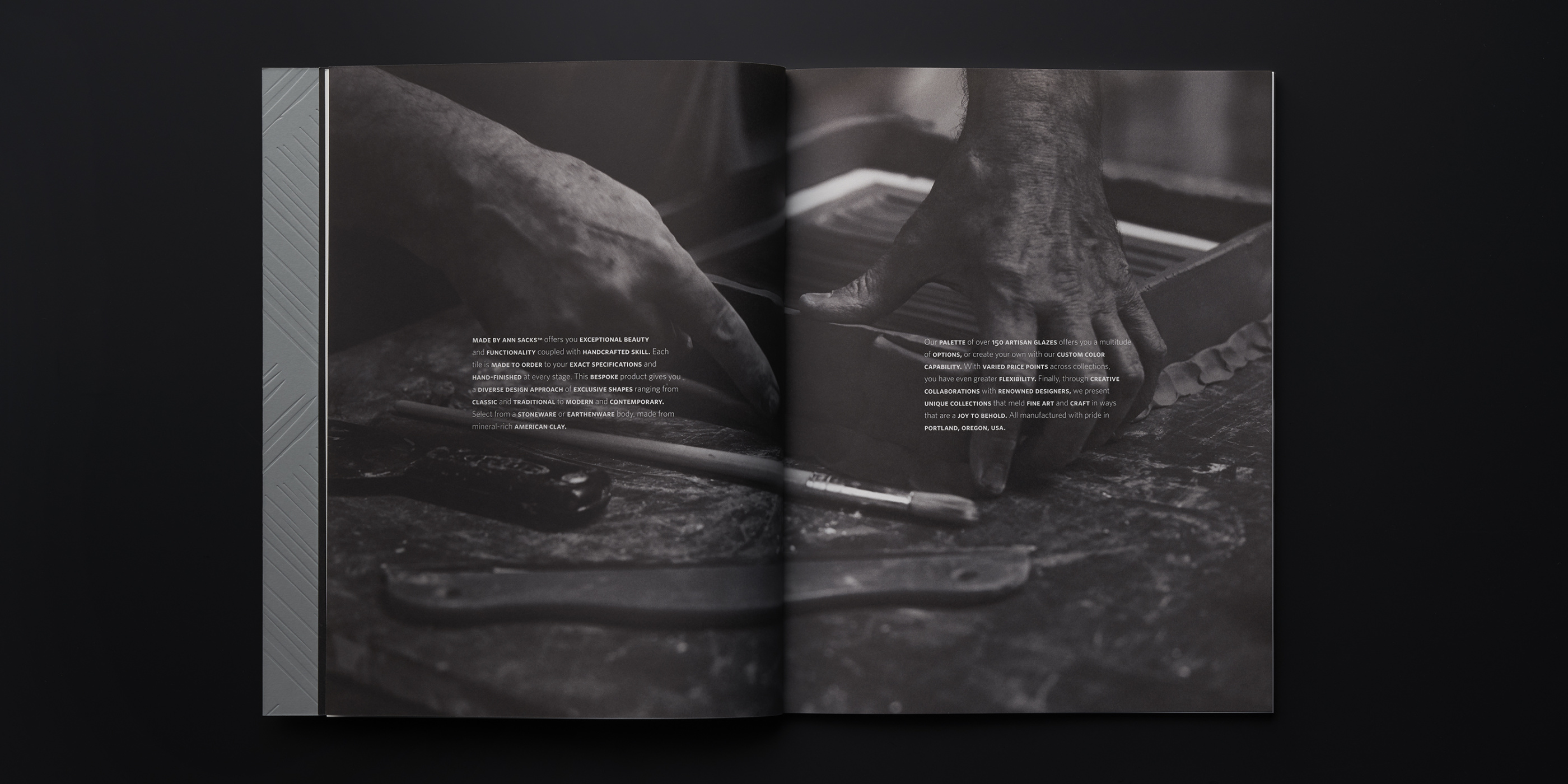 The third edition of the MADE by ANN SACKS brochure continues to reflect the premier quality of Ann Sacks Tile, with updated photography, layout, and content. Perhaps the biggest update is the gorgeous new Superfine Smooth paper stock from Mohawk. It’s the perfect vehicle to tell the handmade story of this artisanal line of ceramic art tile. It brings richness and depth to the product photography, feels lush in the hand, and takes beautifully to the foil and embossing we used on the cover. Mohawk Paper is so pleased with the result that they’re using the brochure as a promotional piece to showcase the qualities of the paper stock.