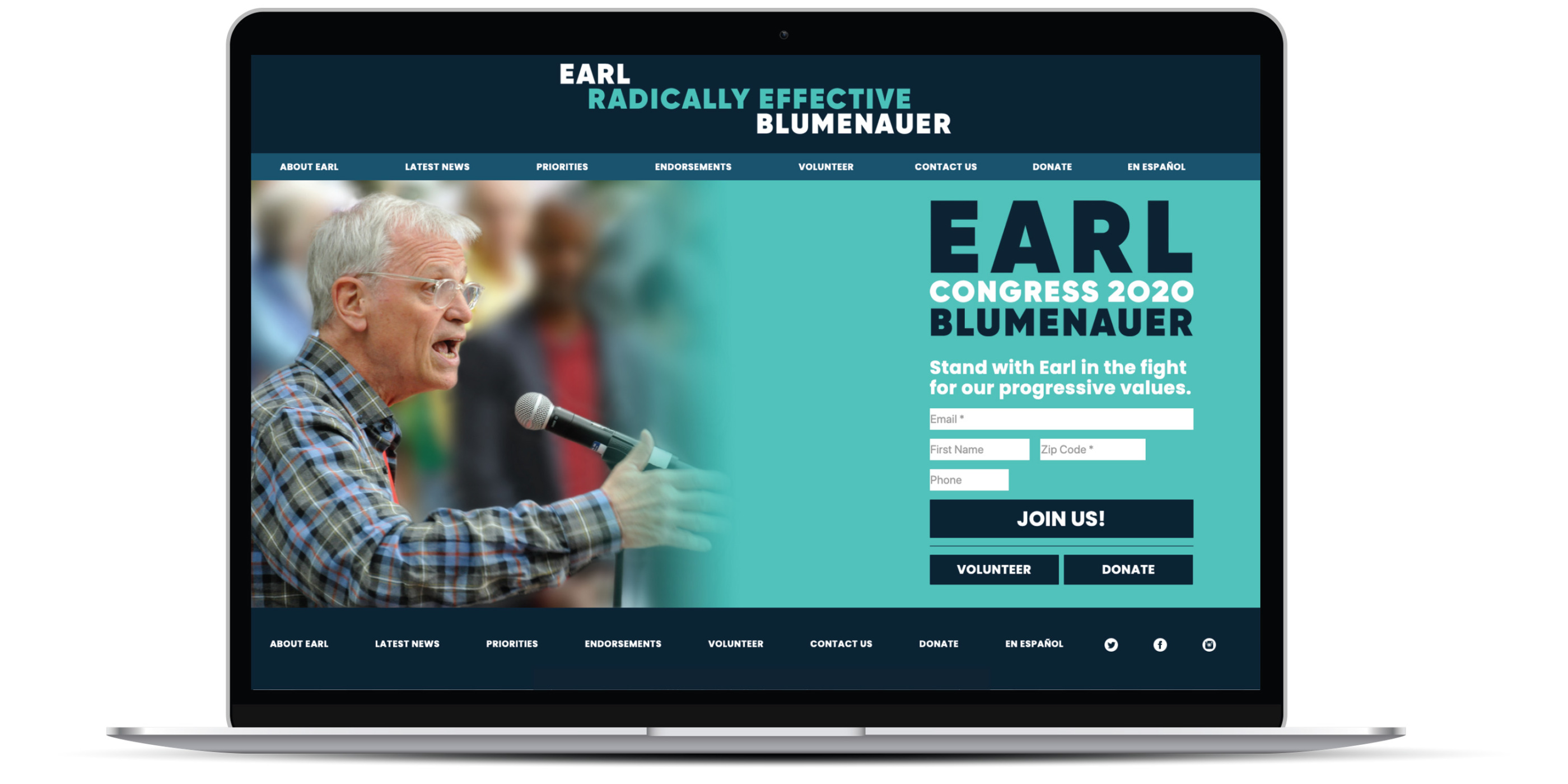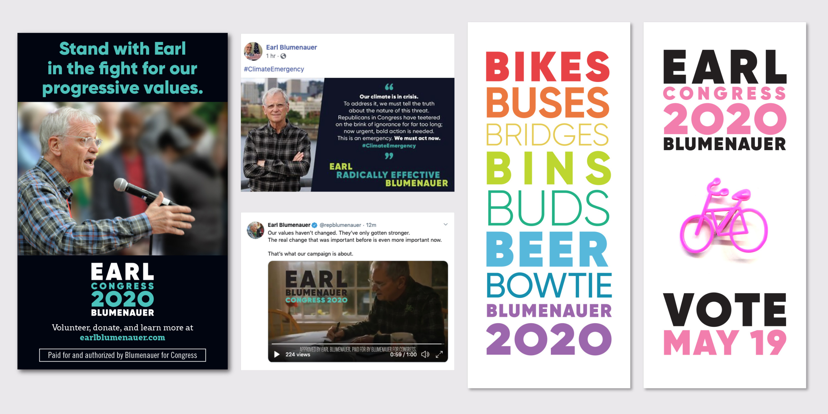US Congressman Earl Blumenauer approached CO Projects to revitalize his branding ahead of his 2020 re-election bid. We embraced the project with enthusiasm, happy to support our Representative – one of the most progressive members of Congress. We immersed ourselves in the policies and people most important to Earl, and learned that not only does he champion forward-thinking legislation, but he works tirelessly behind the scenes to mentor the next generation of forward-thinking legislators. With that knowledge, we created an identity system that breaks the mold of typical political graphics. Inspired by grassroots poster art as well as innovative campaign graphics of recent years, we developed a modular system that incorporates bold color, typography and copy. The signature tagline “Radically Effective,” unapologetically re-positions the term “radical”- so often used as a pejorative – as a positive attribute. The ID system includes an array of secondary taglines that are always sandwiched between Rep. Blumenauer’s first and last names, to communicate a public servant who embodies & lives his policies. PS: Congressman Blumenauer won re-election with 73% of the vote.