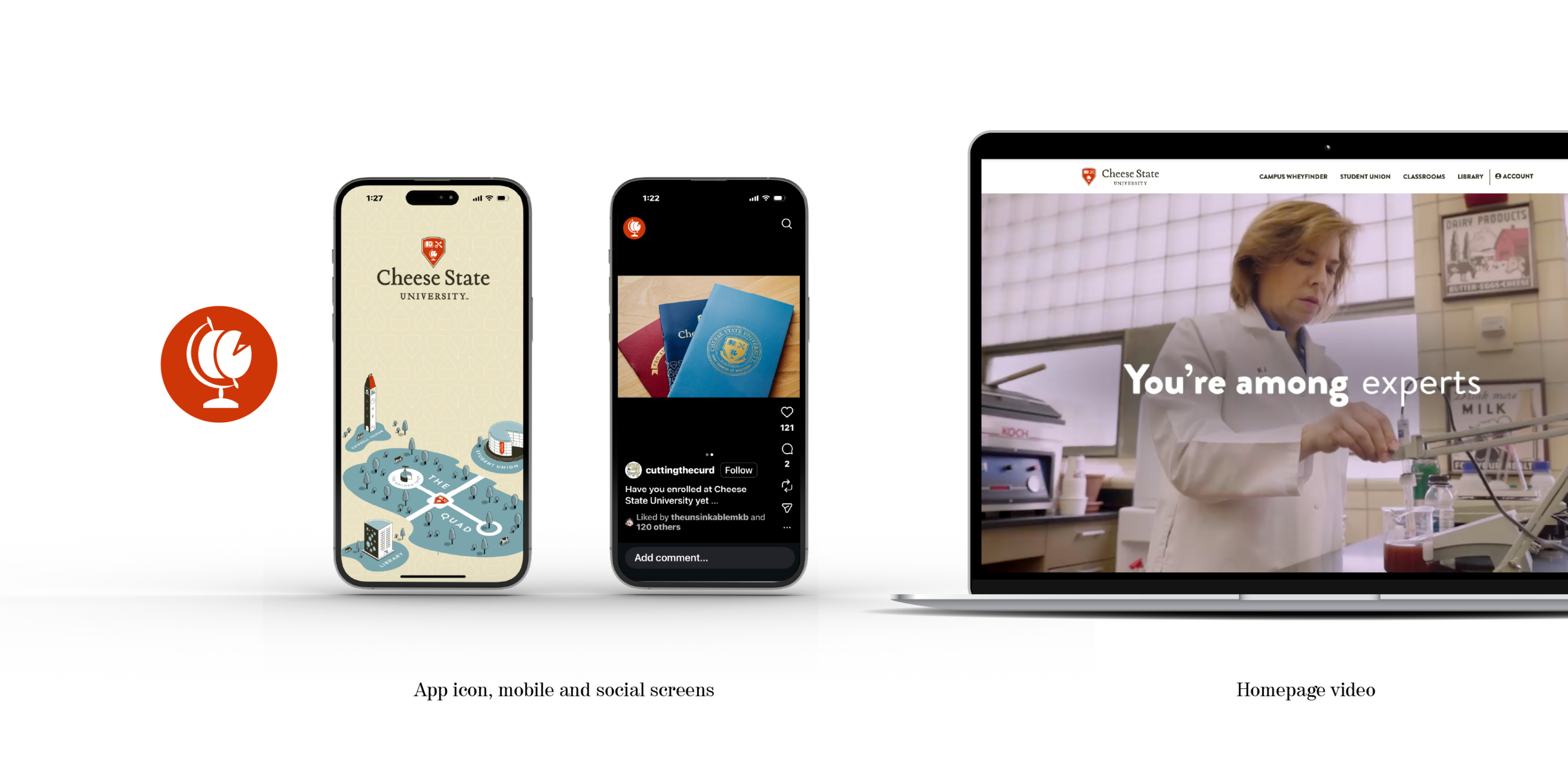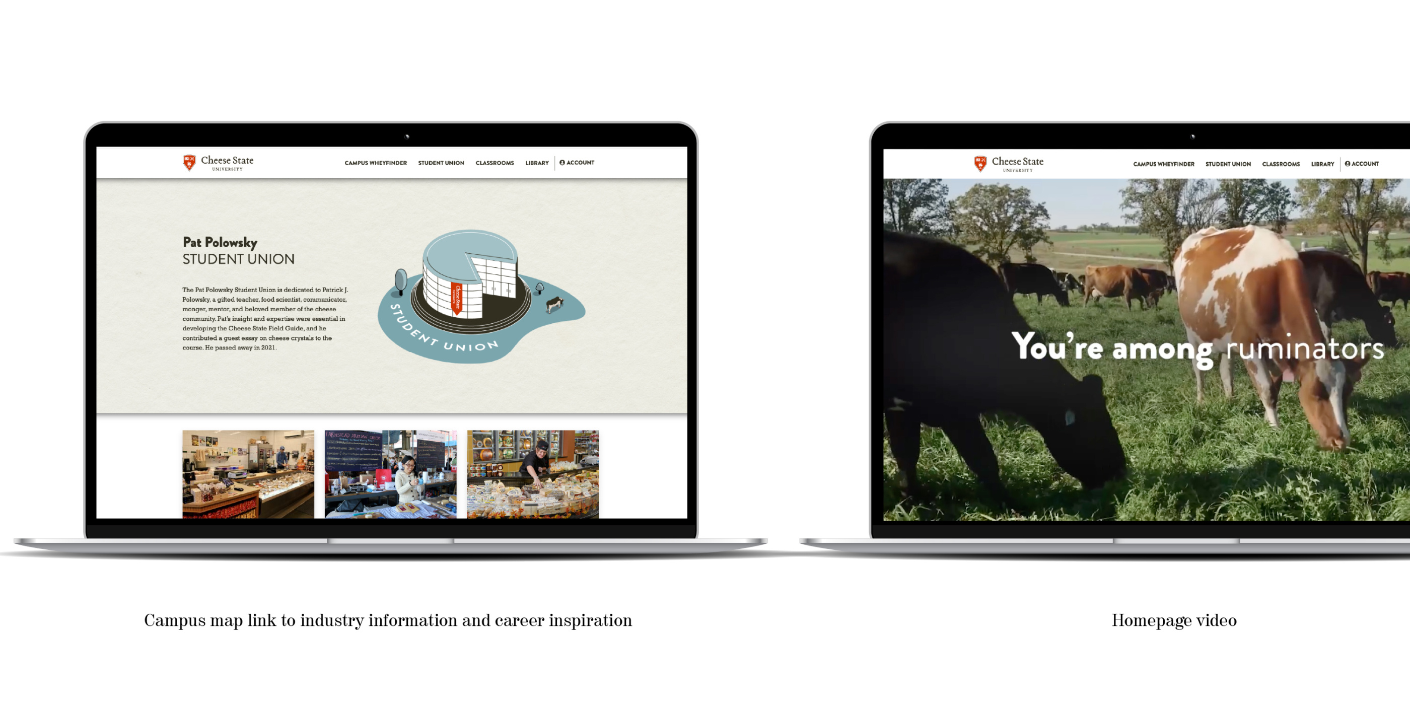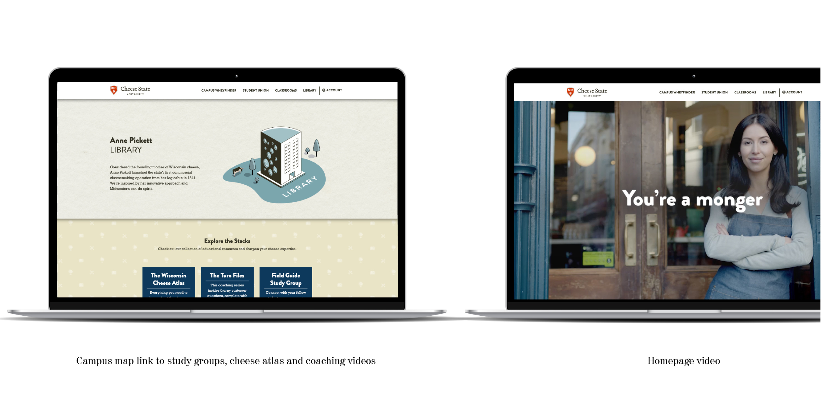 Dairy Farmers of Wisconsin’s newly established Cheese State University required some world-building for their online (cheesestateuniversity.com) endeavor. We immersed ourselves in the iconic symbolism of established universities, crafting metaphors that represent enlightenment and the unlocking of a world’s worth of cheese knowledge and history. We created a digital campus with all the accoutrements of college life for mongers wishing to hone their skills and receive a scholar certificate from the most comprehensive cheese school in the world.