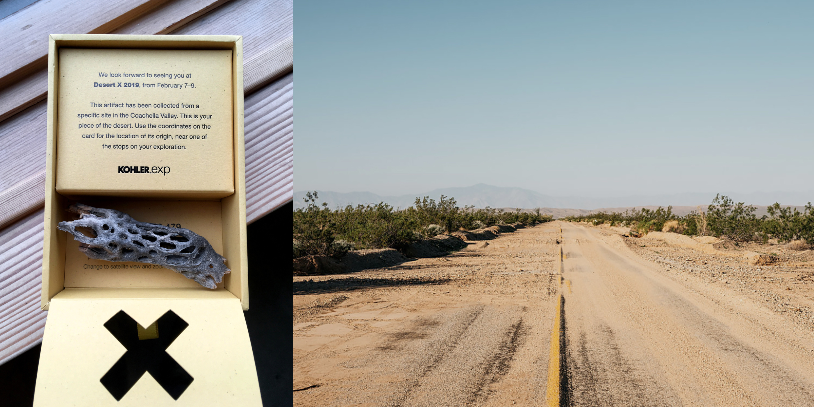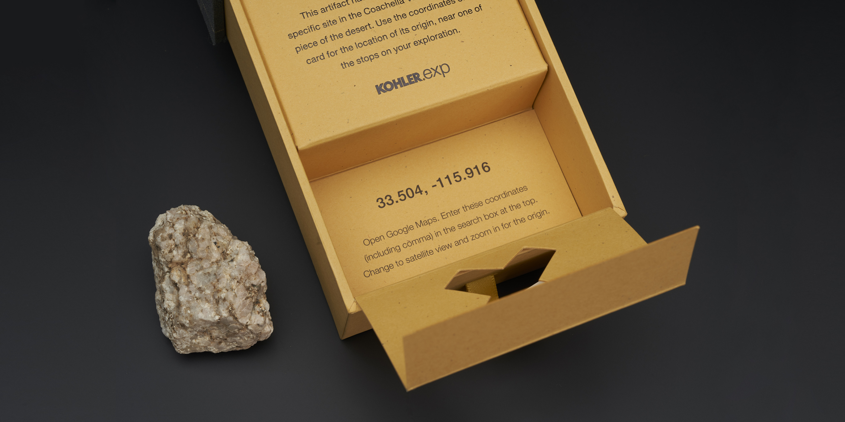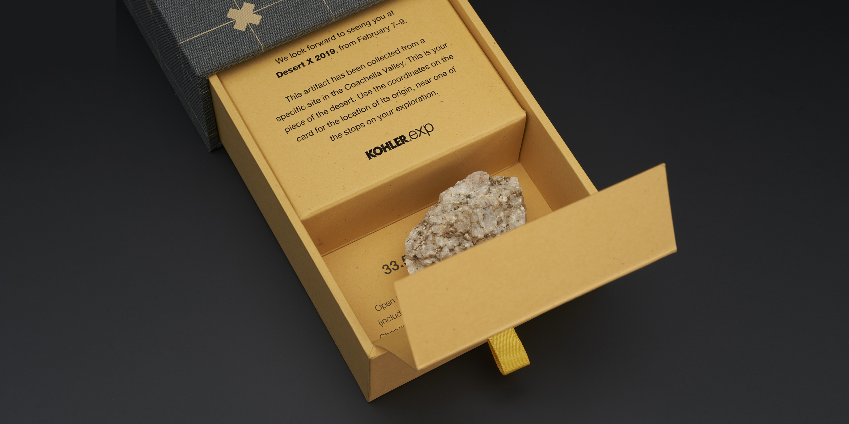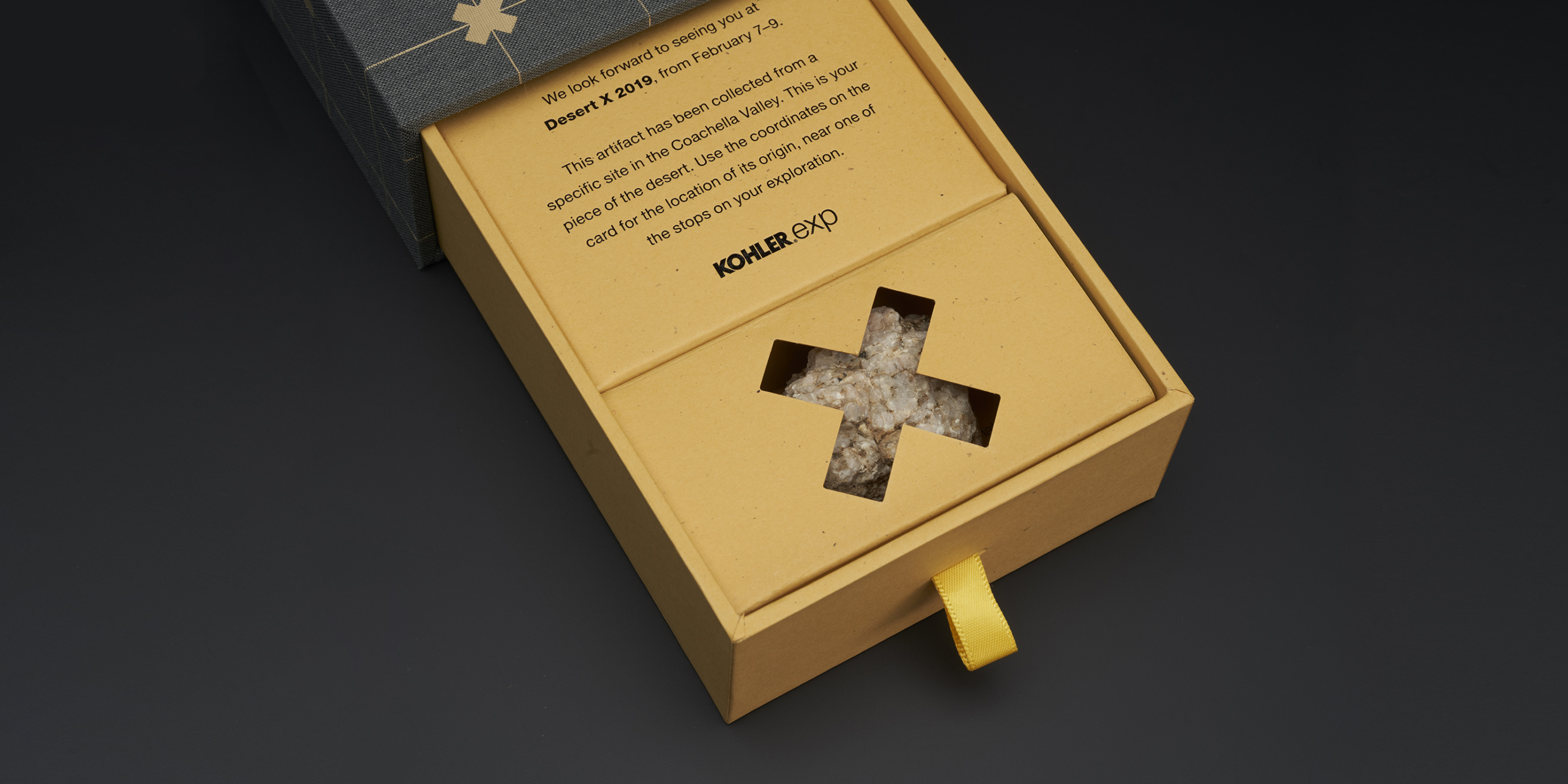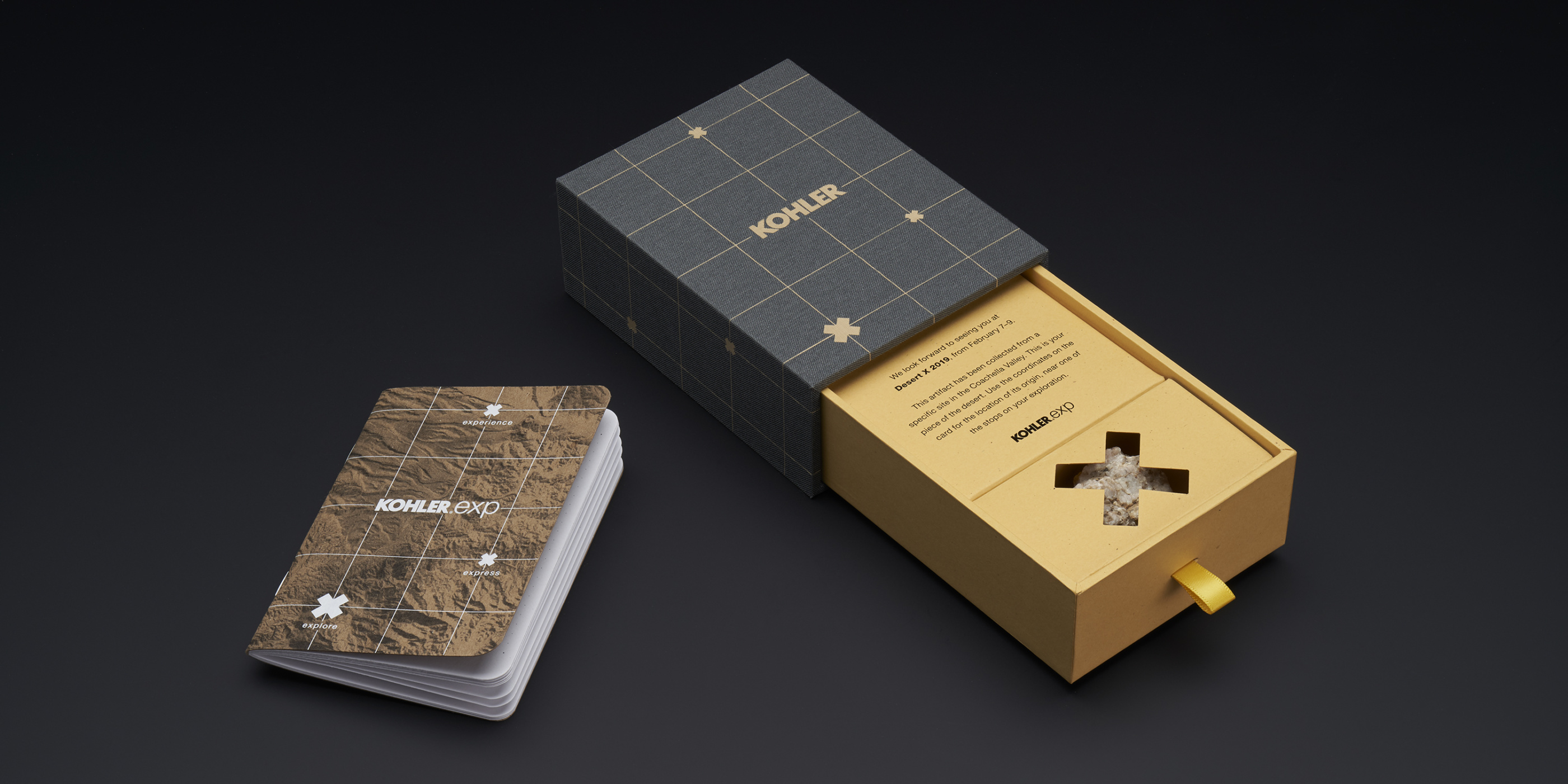 Kohler asked for a unique invitation to lure designers & architects to the biennial Desert X exhibition in the Coachella Valley. We created an experience that focused on the site-specific nature of the art installations. Each recipient was sent a linen drawer box with an artifact from twelve specific sites in the desert; samples like rocks, minerals, or vegetation collected from their upcoming tour sites. Printed GPS coordinates allowed the recipient to explore a Google Earth satellite view of their artifact’s location in and around the Desert X installations. Each box contained a personal field guide for notes.