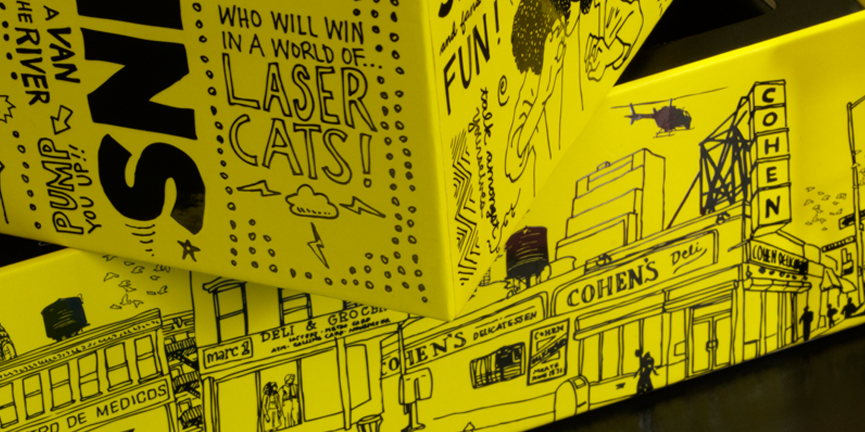 This is what they call a “good problem” – naming, designing and packaging a game which draws on 40 years of SNL history. Our solution was to capture the raw immediacy of SNL’s writing process and live performances, which we achieved through hand-drawn illustrations of legendary characters and catchphrases. The package also communicates the fun of playing the game itself, which combines trivia, improv, and quick-fire team play. Discoverable images are hidden throughout the whimsical NYC street scenes depicted on the inside of the box. The pure yellow package, punctuated by gloss black illustrations, jumps off the shelf in a crowded retail setting.